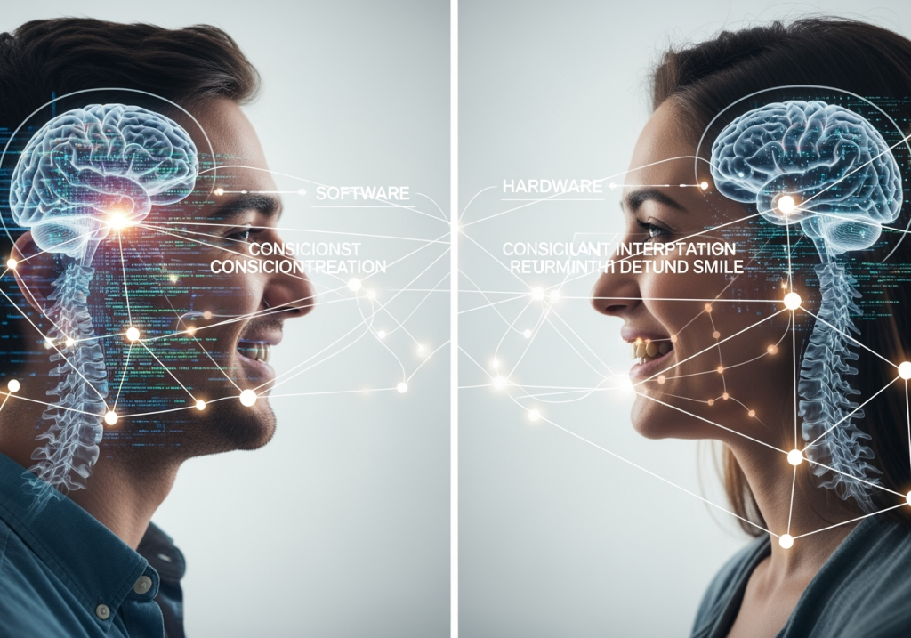 A simply analogy: You see a close friend, your conscious (software) causes your brain (hardware) to create a smile. Your friend sees the smile (hardware) and interprets their mood and consciously feels elated (software) and causes the brain (hardware) to smile in return.
